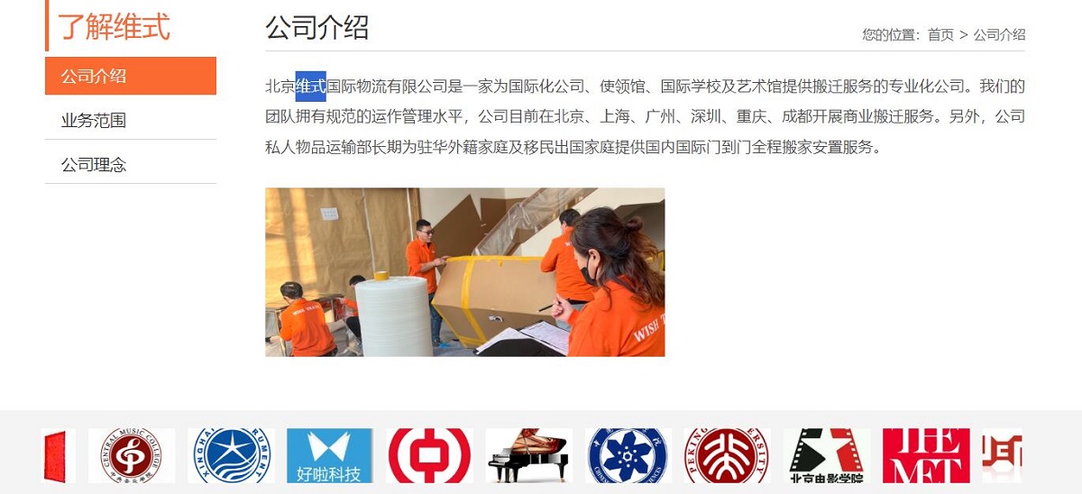 北京維式國際物流有限公司是一家為國際化公司、使領(lǐng)館、國際學校及藝術(shù)館提供搬遷服務的專業(yè)化公司。我們的團隊擁有規(guī)范的運作管理水平,公司目前在北京、上海、廣州、深圳、重慶、成都開展商業(yè)搬遷服務。另外,公司私人物品運輸部長期為駐華外籍家庭及移民出國家庭提供國內(nèi)國際門到門全程搬家安置服務。