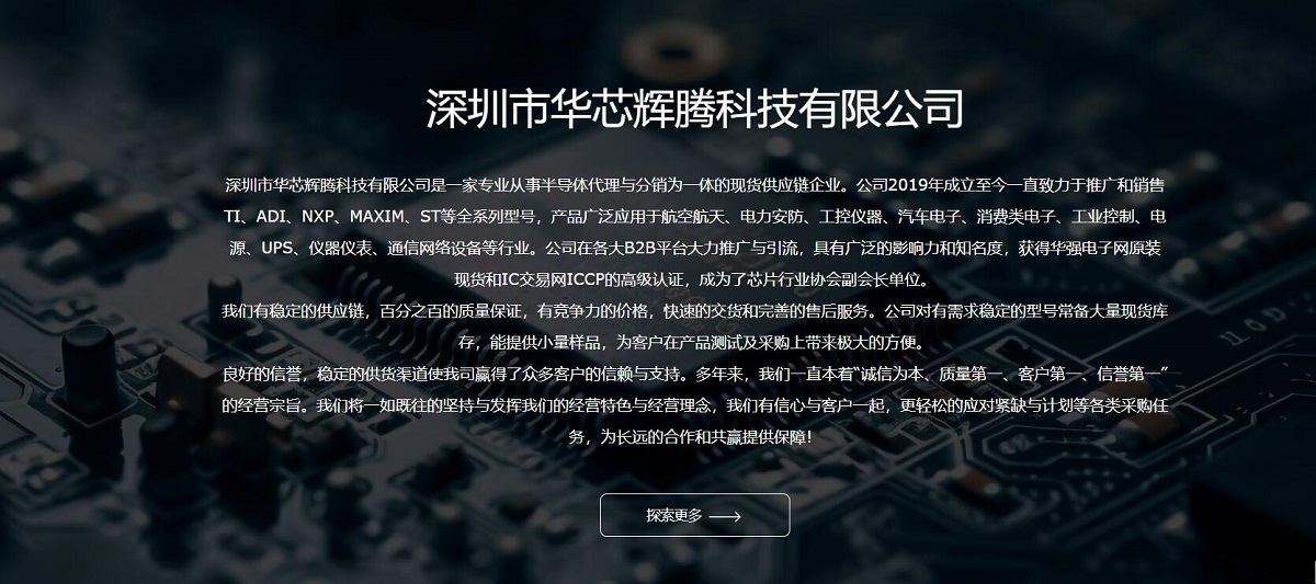 深圳市華芯輝騰科技有限公司是一家專業(yè)從事半導(dǎo)體代理與分銷為一體的現(xiàn)貨供應(yīng)鏈企業(yè)。公司2019年成立至今一直致力于推廣和銷售TI、ADI、NXP、MAXIM、ST等全系列型號,產(chǎn)品廣泛應(yīng)用于航空航天、電力安防、工控儀器、汽車電子、消費(fèi)類電子、工業(yè)控制、電源、UPS、儀器儀表、通信網(wǎng)絡(luò)設(shè)備等行業(yè)。公司在各大B2B平臺大力推廣與引流。