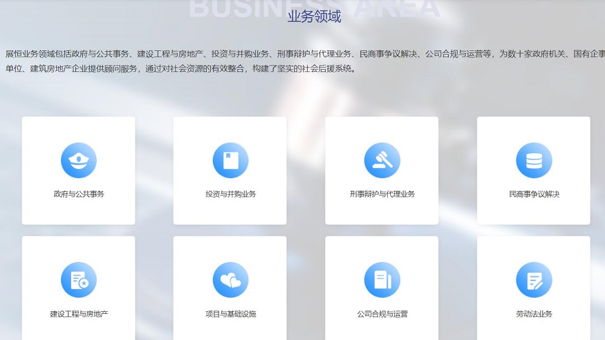 展恒業(yè)務(wù)領(lǐng)域包括政府與公共事務(wù)、建設(shè)工程與房地產(chǎn)、投資與并購(gòu)業(yè)務(wù)、刑事辯護(hù)與代理業(yè)務(wù)、民商事?tīng)?zhēng)議解決、公司合規(guī)與運(yùn)營(yíng)等,為數(shù)十家政府機(jī)關(guān)、國(guó)有企事業(yè)單位、建筑房地產(chǎn)企業(yè)提供顧問(wèn)服務(wù),通過(guò)對(duì)社會(huì)資源的有效整合,構(gòu)建了堅(jiān)實(shí)的社會(huì)后援系統(tǒng)。