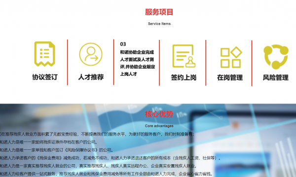 和諾人力資源有限公司, 殘疾人招聘一站式服務(wù)平臺,是一家致力于殘疾人創(chuàng)業(yè)扶持、就業(yè)推薦、教育培訓(xùn)、健康管理、福利保障、心理呵護等服務(wù)的專業(yè)機構(gòu)。公司通過完整的服務(wù)體系和豐厚的企業(yè)資源以及社會資源,竭力為每一位殘疾人朋友尋得一份符合其自身能力、個人意向的滿意工作。