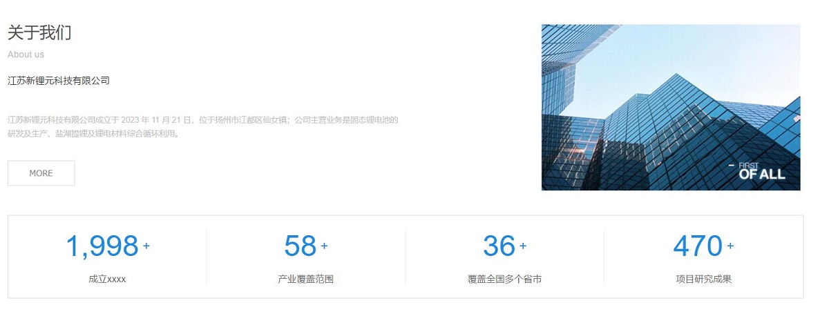 江蘇新鋰元科技有限公司成立于 2023 年 11 月 21 日,位于揚(yáng)州市江都區(qū)仙女鎮(zhèn);公司主營業(yè)務(wù)是固態(tài)鋰電池的研發(fā)及生產(chǎn)、鹽湖提鋰及鋰電材料綜合循環(huán)利用網(wǎng)站建設(shè)